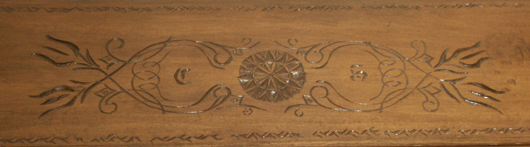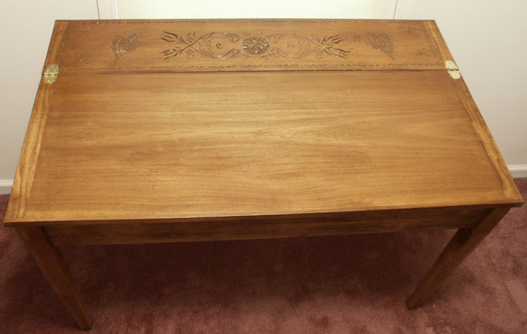 A simple style, mission/country combination this flat top poplar desk features a full size lid to conceal the implements of creative writing and a solid mortis and tenon construction. Hand carving ornaments the simple light finished piece, and a mitered banding on the lid provides a finishing touch.