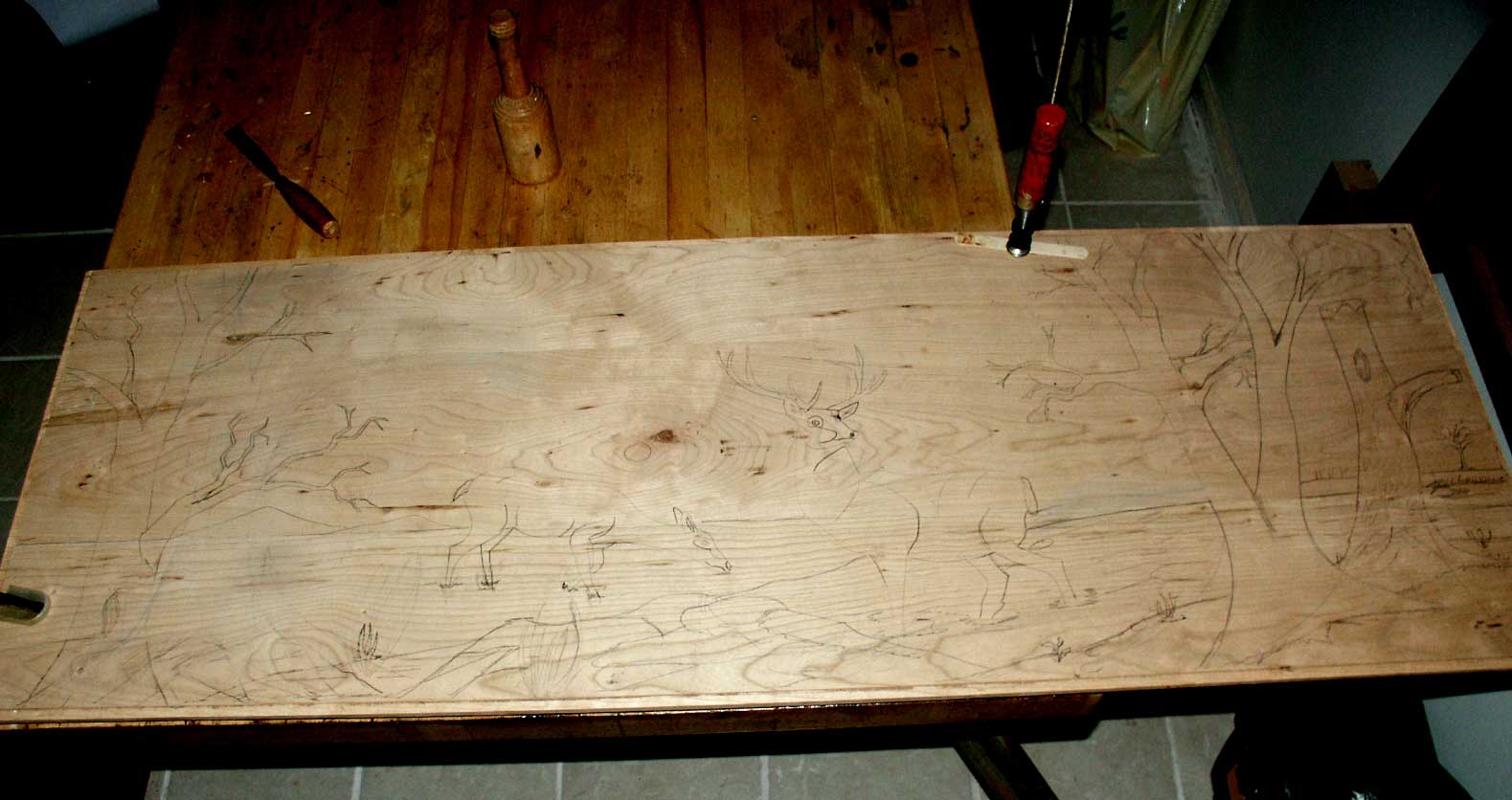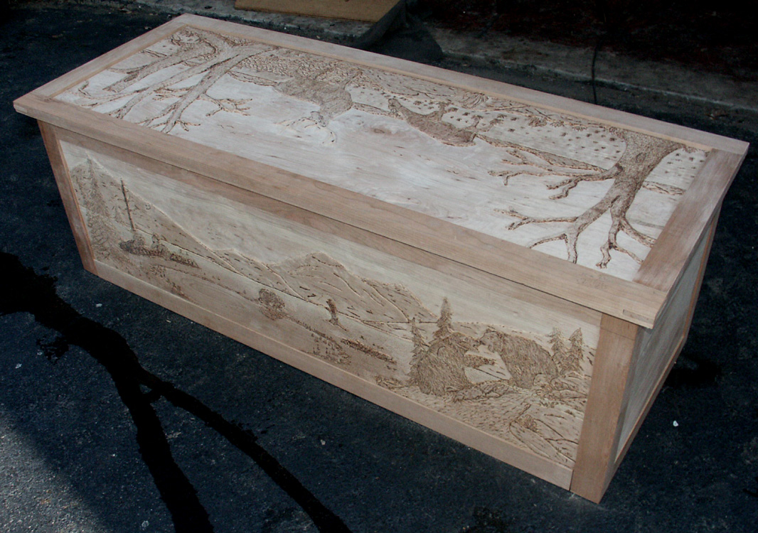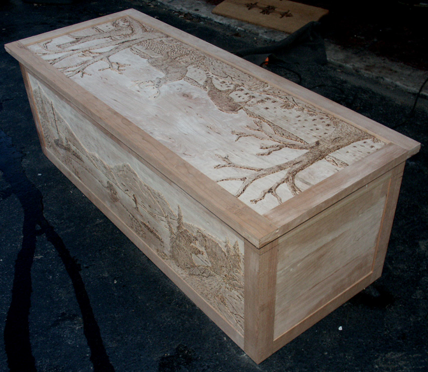 These photos show the chest with the carving and burning completed. We should note, that we offer carvings of all sorts without tinting, just the natural finish or stain applied to the wood brings out an amazing warm glow even without color.