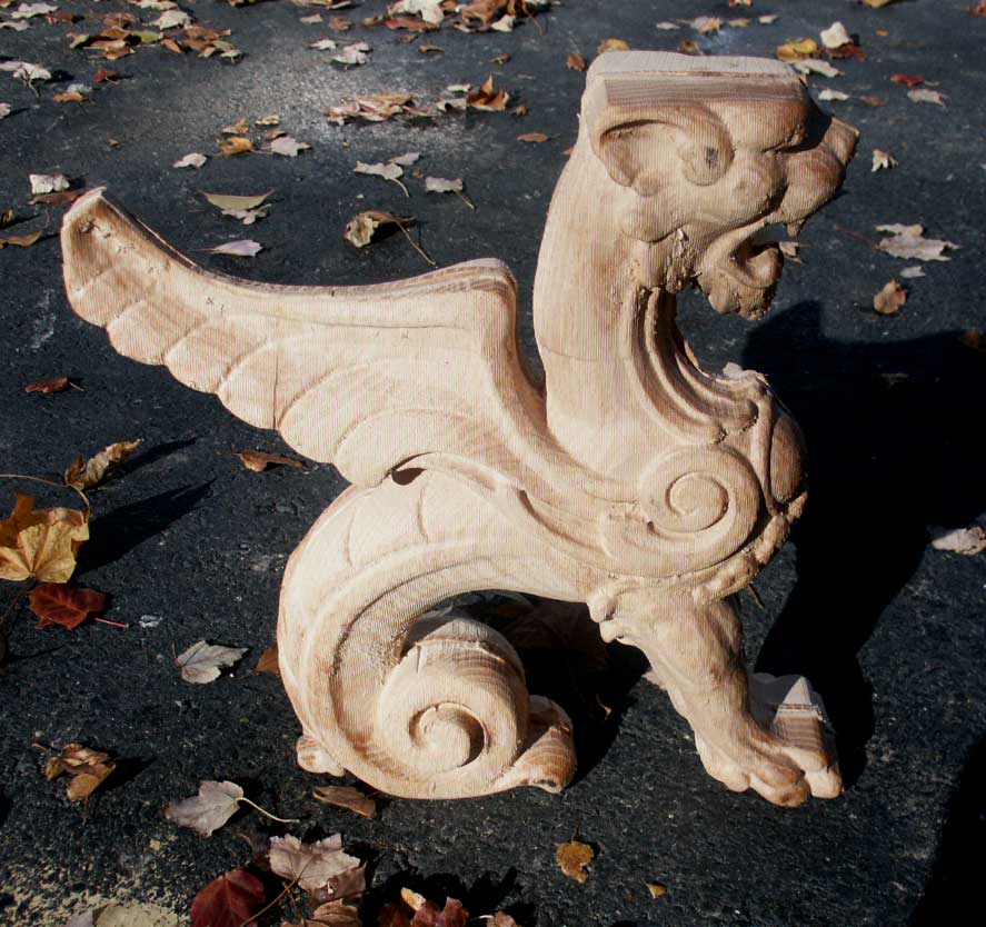 A combined effort of Artisans and Custom Creations, we have now successfully cloned a line of griffins. The original and two clones stand in line above. The original was CNC scanned, and ruffed out on a high speed computer controlled router courtesy of Custom Creations, then hand detailed by Artisans. This combined talent allows for a cost savings compared to single hand reproduction methods.